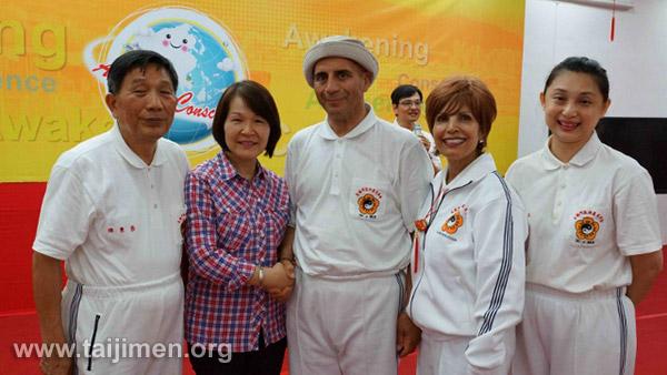 美國好萊塢名人安東尼奧.吉里尼與慕妮.艾倫十分推崇洪道子博士及其推動世界愛與和平的卓越貢獻,因此加入太極門並追隨其腳步成為「良心時代運動」的推動者。這次兩位更連袂來台,適逢端午節假期,特別到新竹苗栗體驗台灣節慶文化,現場他們也分享了在太極門練氣功的收穫。