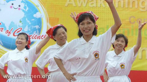 節目一開始,來自苗栗縣地區各行各業的太極門弟子,並帶來熱情的小蘋果舞蹈、客家歌曲的輕快歌聲,傳達出滿滿的愛與歡喜,並感染了觀眾也跟著音樂熱情的拍打節奏,還有陸上龍舟比賽的遊戲,加油歡呼聲不斷,全場洋溢著團結同樂的氣氛!最後由一群太極門青少年展現活力十足的龍馬舞展演,將現場氣氛帶到最高點。苗栗縣副縣長鄧桂菊非常感動的表示,客家山歌以及龍馬舞等等每一場表演都很精采,聽到客家本色、天公落水這二首歌曲,看到太極門所有的師兄、師姊是用真心在帶領我們的社區,苗栗太需要大家的正向能量了,太極門甚至可以感動全國跟全世界,今天還有來自好萊塢的大導演兩位外國朋友來到苗栗,她最大的感受是太極門是非常有活力的,在這裡感覺到非常多的歡樂,每一位師兄、師姊都是打從心裡誠懇和真心的分享,這是一個很棒的團體。