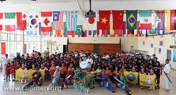 由太極門氣功養生學會、聯合國NGO世界公民總會、世界之愛和平總會所組成的良心時代國際志工,以搶答方式和7到13歲的學童們互動,引導他們建立人人都是良心領袖的觀念。在文化交流時,太極門祥獅以靈活的身段步伐和小朋友近距離互動,展現祥獸的親和力。當志工們高唱Love and Peace Song時,小朋友們也跟著旋律輕輕點頭、擺動身體,沉浸在和諧的氛圍裡。當黑面孔的包青天出現時,立刻引起騷動,小朋友們看得目不轉睛,一方面聆聽解說,也同時從歌聲中感受歷史故事裡表彰正義的精神,贏得師生和隊輔志工們的熱烈掌聲!