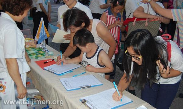 樹林火車站過往旅客,母子熱情響應「良心時代運動」全球連署活動。