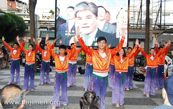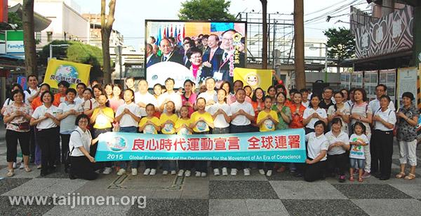 這群來自世界之愛和平總會、聯合國NGO世界公民總會、太極門氣功養生學會等組織的良心時代國際志工,身著白色、黃色良心T恤與橘紅色上衣的Energy Boys & Girls,馬上吸引了民眾的目光;下午5時,一群國中小、高中與大學生的良心天使以「良心時代運動」主題曲揭開活動序幕。