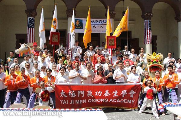 應聖荷西玫瑰白與藍大遊行主辦單位的邀請,太極門逾百位師兄姊來自世界各地共襄盛舉,太極門掌門人洪道子博士伉儷(中)與州議員Evan Low(右五) 、市議員 Ash Kalra(左六) 和Cupertino 前市長 Gilbert Wong(右六) 合影。