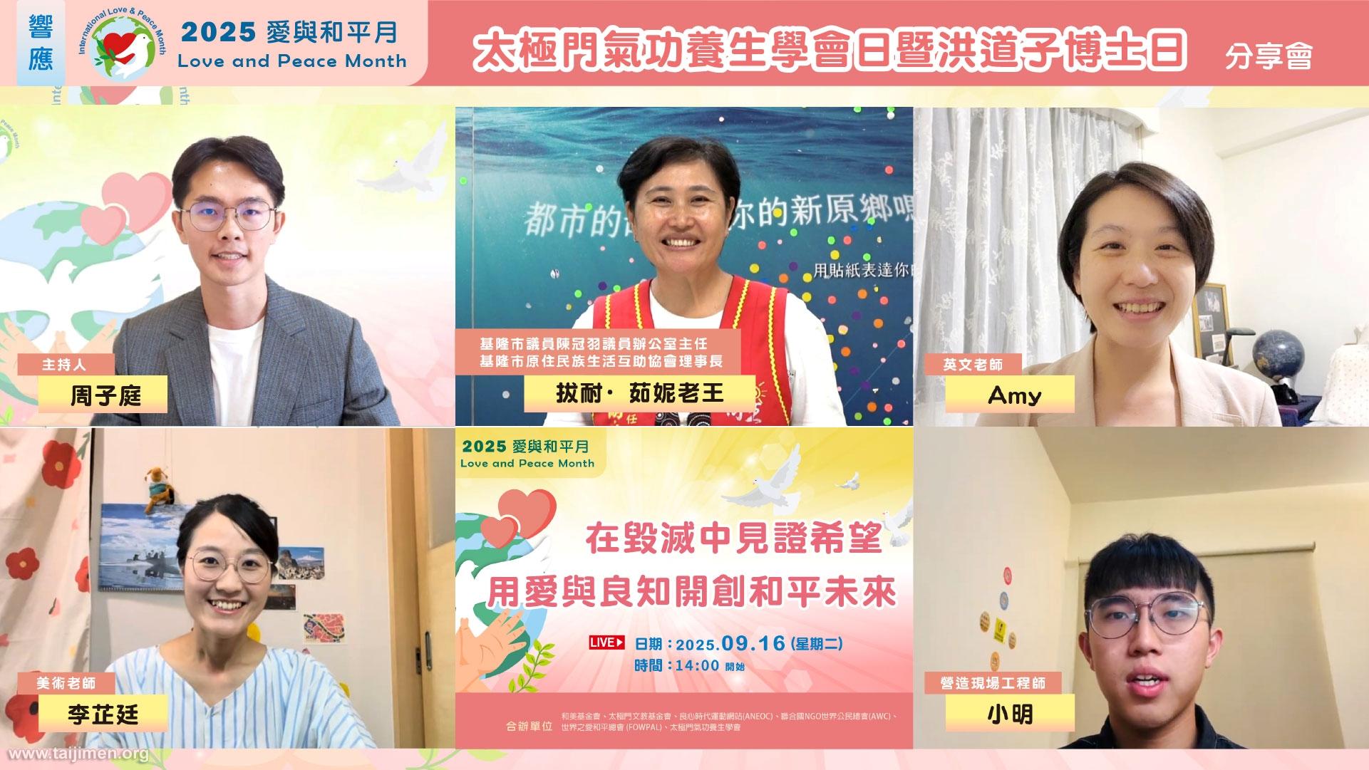 美術老師李芷廷以「用藝術與微笑傳遞愛與和平」為題,分享她透過太極門氣功修行與陰陽哲學、待人處事、應對進退,從內向害羞的少女,學會正向溝通與自我成長,蛻變為勇敢助人的文化志工,跟隨洪道子博士推廣愛與和平的理念。近幾年她曾在土耳其、美國、汶萊等地展演舞蹈與合唱,突破語言障礙,傳遞愛與和平的正能量。她表示,藝術是心靈的語言,能喚起人們最純粹的美善力量。
