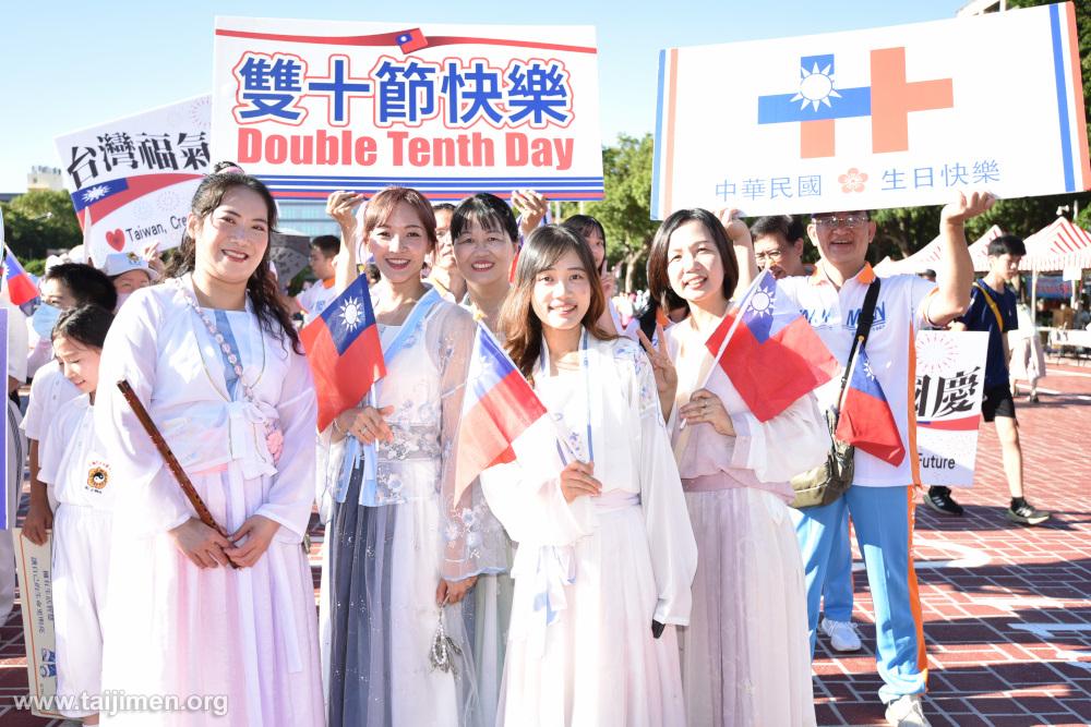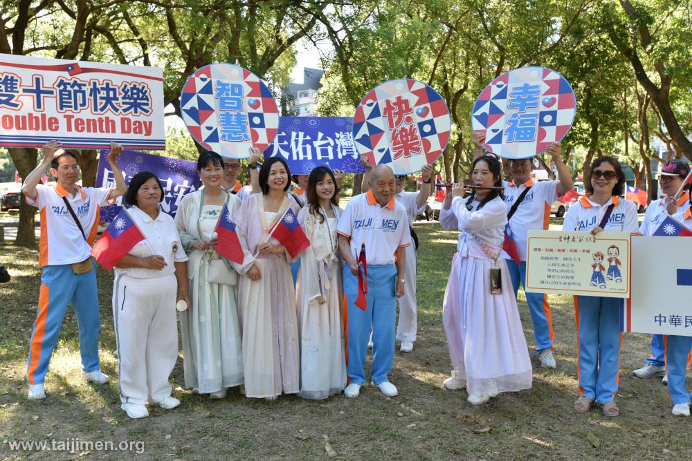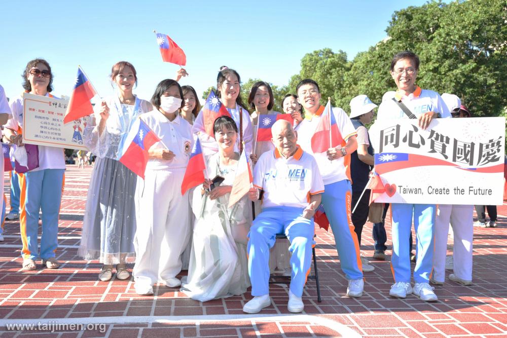 不畏艷陽,太極門師姊們身著古裝亮相登場,神采奕奕,笑臉洋溢,成為現場焦點。若得知這些俠女中有人的孩子已大學畢業,鐵定讓人跌破眼鏡,忍不住探詢駐顏之術。92歲的何智棋師兄精神抖擻地為國家生日獻上誠摯祝福,他原本行動不便,自從今年竹北道館成立時入門練功後,精神、體力明顯改善,當天更穩健地展現活力。