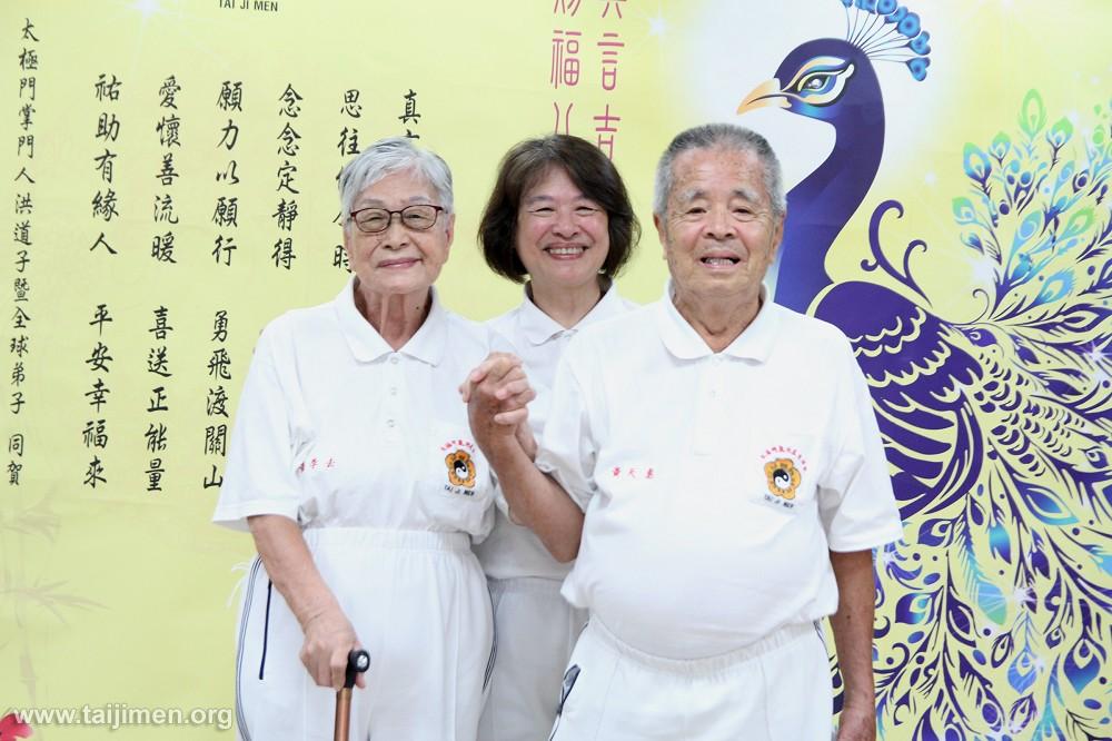 淑美(中)以自身改變帶動家庭,父母在她的陪伴下開始練功,至今九十高齡仍健康自在。
