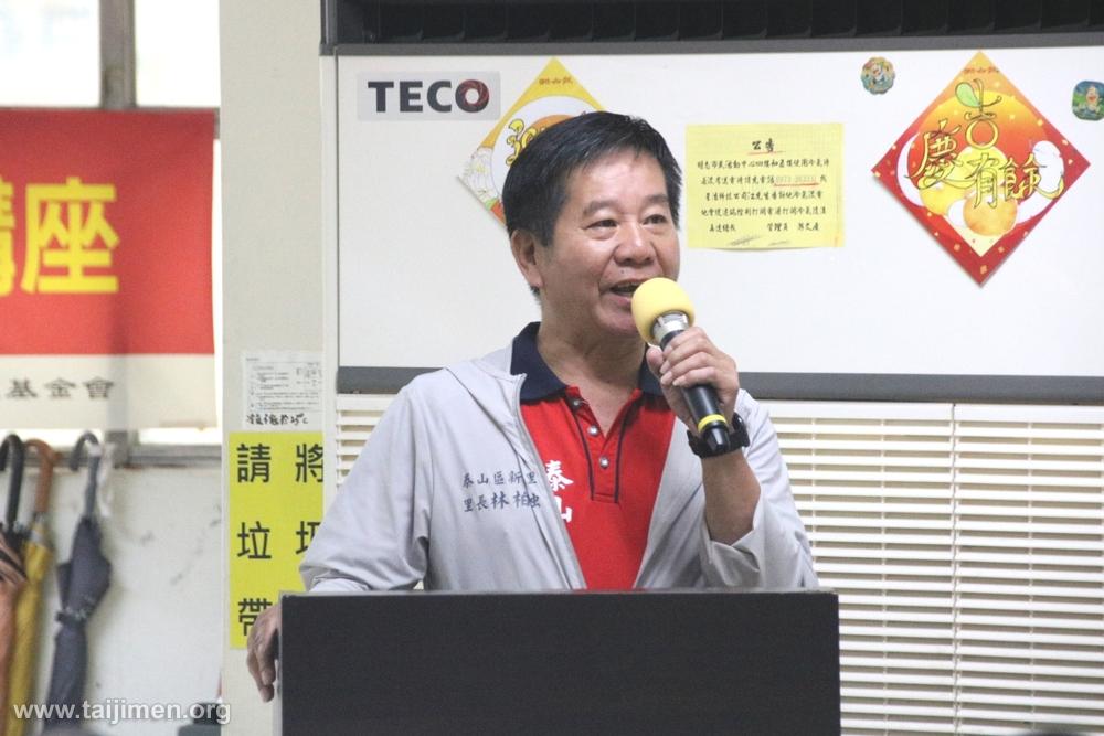 新明里林柏融里長表示,現在天氣變冷了,要里民與志工們注意保暖與身體健康,同時感謝太極門一起合辦這個活動,尤其是蔡醫師的養生之道,幫助大家把身體照顧好。新北市議會宋明宗議員服務處主任蔡佩呈代表宋議員出席時表示:台灣正面臨超高齡社會,要有好的養生觀念,尤其是身心靈都要養生,心要淨化、身體要跟隨養生之道。她也希望太極門樹林道館能夠遍地開花,把這樣的福分種在大家心中。