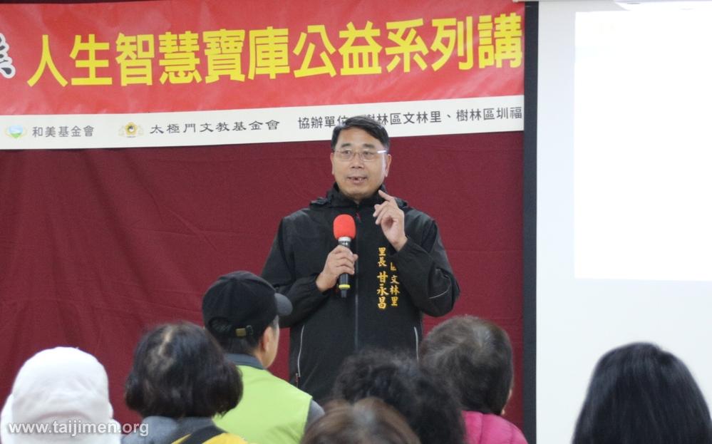 甘永昌里長首先提到該里推動預防保健已經二十多年,並與多家醫院每個月共同推動講座,為的是讓里民們一起來預防慢性疾病,不要只是待在家裡吃藥,走出來心情好,藥量也可以減少,他說:「今天的健康講座讓大家了解一下什麼是氣功,讓大家減輕身體上的壓力,健康快樂兩百歲!」