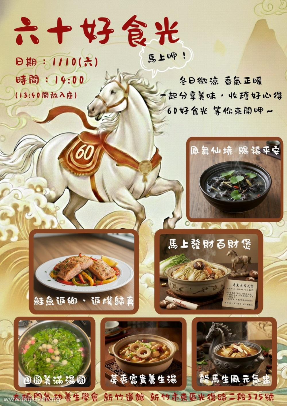 太極門新竹道館表示,「60好食光」系列活動自1月3日至2月8日陸續展開,期盼透過年菜品鑑與交流,串聯家人情 感、凝聚正向能量,象徵太極門60年來持續推動身心靈健康的初心與傳承,邀請更多民眾一同加入