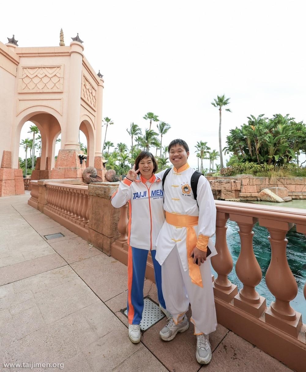 陳姿伶與兒子胡修禕參與太極門親訪團加勒比海弘揚行,在巴哈馬天堂島溫馨合影。
