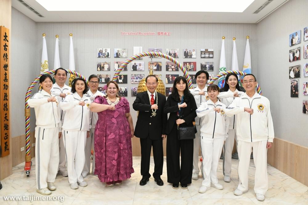 太極門掌門人洪道子博士帶領弟子,熱烈歡迎馬紹爾群島駐華大使卡蒂爾於3月25日蒞臨拜會,留下珍貴的合影。
