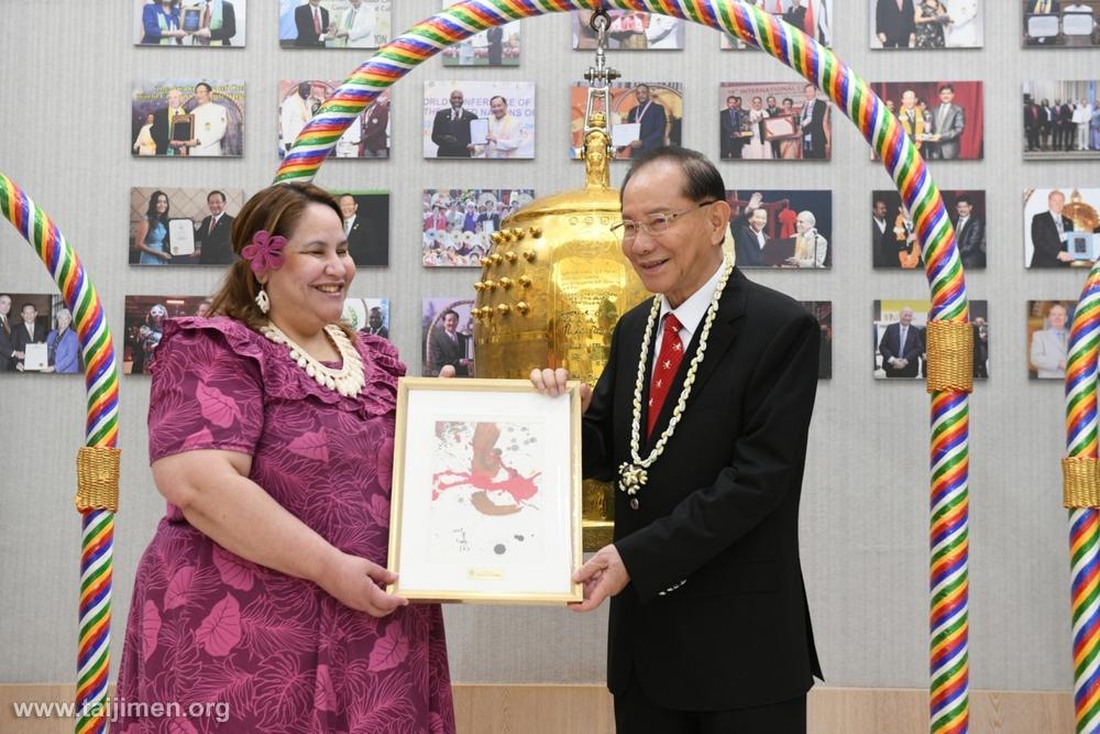 在雙方深度的文化交流中,卡蒂爾大使帶來一份極具份量的馬紹爾國寶級禮物——「貝殼編織掛飾」及項鍊。這件結合頂尖林投葉編織與貝殼鑲嵌技藝的工藝品,象徵著大自然的回饋與海洋的祝福,展現了馬紹爾的「Iakwe」精神,當地通常僅在特別慶祝場合贈予貴賓,代表對收禮者家庭的保護與和諧。太極門洪道子博士亦回贈珍藏的畫作「視角」、象徵生命之光的LIFU絲巾,以及良心鑰匙圈、良心書籤與良心希望日特刊,為交流留下美好印記。陪同來訪的廖秘書開心地表示,她過去就對太極門的精彩展演印象深刻,