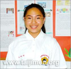 我很感謝我的師父,因為我以前真的很膽小、很害羞,不敢面對陌生人說話,現在透過每星期來館練功學習,師父教的自我突破,學習自己鼓勵自己、隨時做好上台的準備,師兄姊會鼓勵我們上台分享,台下師兄姊都會給我們掌聲。我經過一次又一次的訓練,進步了,我更勇敢了,我把師父對我的愛及關心,帶到學校主動關心同學、互相檢討功課、教學相長,彼此功課都有進步,在今年的模範生選舉,我更代表班上接受縣長的表揚,這一切的進步真的感謝我的師父給我一個自我改造的環境--太極門。
