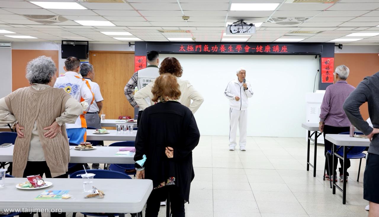 由太極門氣功養生學會內湖道館主辦的公益系列講座, 11月2日在林口區公所舉行,邀請到曾任台北市立和平、仁愛、忠孝醫院三院院長的吳康文醫師,分享如何因應現代社會普遍的「三高」問題。85歲的吳康文在太極門練氣養生多年,身體保持健康靈活,以幽默智慧之語分享深厚的醫病經驗,林口區民眾熱烈請益,表示收穫良多。新北市議員李宇翔特助李敏豪先生亦親臨現場,肯定太極門一年多來在林口地區持續舉辦多場健康講座,積極推廣身心靈健康的努力與貢獻。