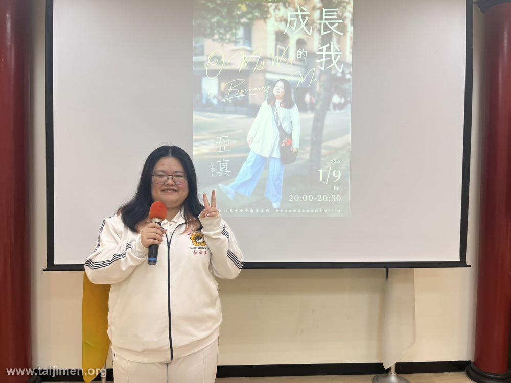 「在太極門成長是很幸福、也很幸運。」李亞真學到勇氣、耐心並充滿能量。一路走來,她累積經驗,學會了利用時間、溝通交流、自信表達與轉念心法,隨時做好上台的準備,能以自信與勇氣迎接更多挑戰。