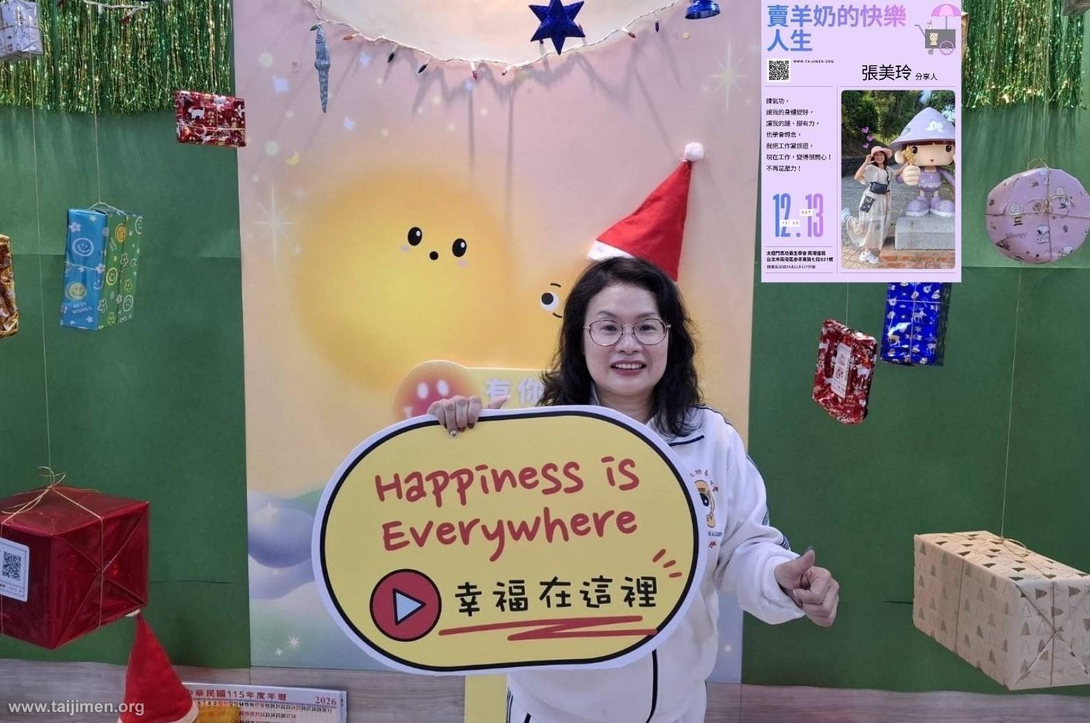 張美玲很感謝師父教誨要「勇敢往前走」,所以現在她無論遇到任何困難,都會以心平氣和、歡喜面對,把工作當修行,把人生當作旅程。她笑說:「每天都要往前走,不進則退。練功、打坐讓我更加有耐性,個性變柔和,也讓我在生活中更快樂。」讓自己的身心靈都蛻變,她希望未來能把這一份快樂分享給更多的人。