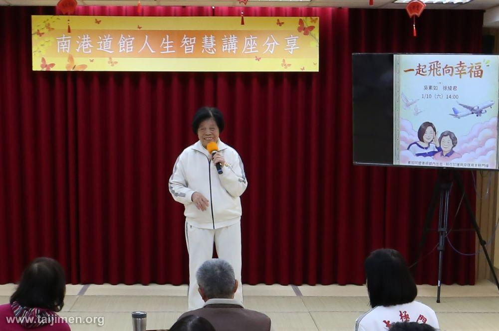 當吳素如的先生病逝時,她感到非常難過,因為常到道館與師兄姊談心,獲得許多關懷與溫暖,學會轉念與放下逐漸走出低潮,變得開朗、懂得凡事往好處想。62歲考駕照,開車接送師兄姊與朋友,現在雖然獨居,