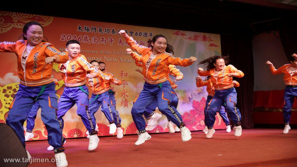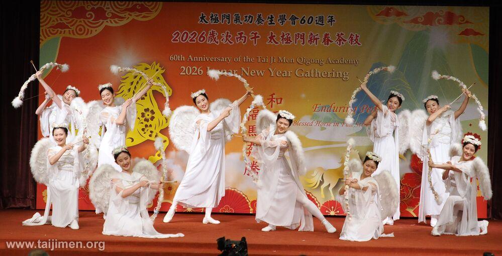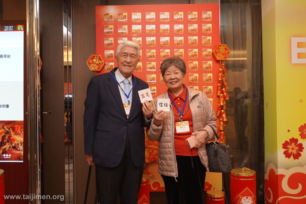 太極門氣功養生學會慶賀一甲子,今年新春茶敍現場特別熱鬧,迎賓環節別具巧思,祥獅、仙童「足爽」(台語ㄊㄩㄥˇ)寶寶與福馬共同歡喜迎賓,還有各種充滿傳統年味的活動如:滾元宵、套圈圈、戳戳樂等,讓外國嘉賓體驗不一樣的文化魅力。