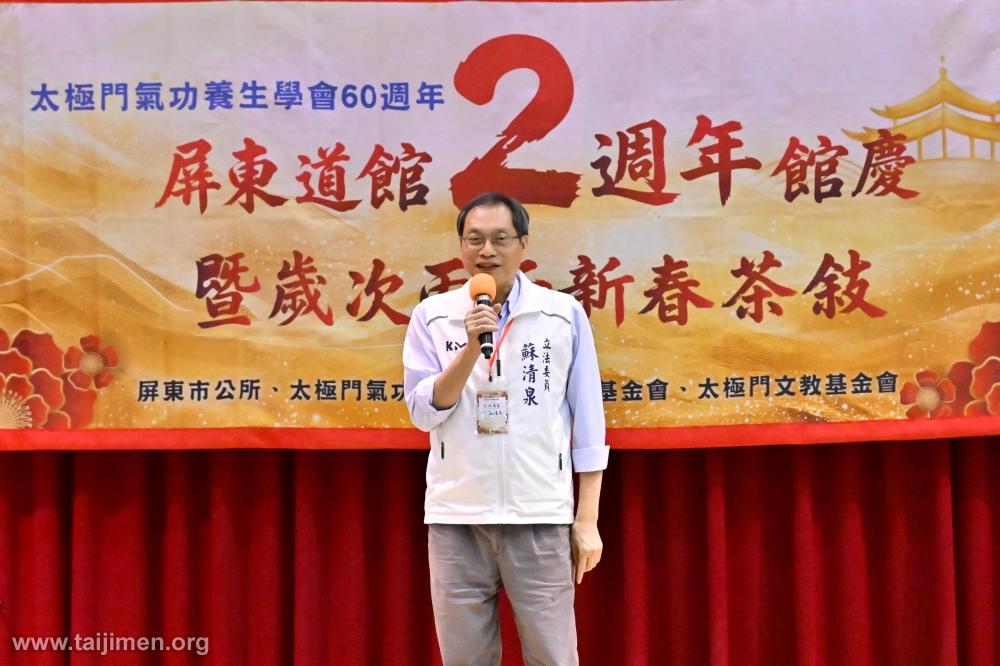 立委蘇清泉表示,太極門氣功養生學會真的很棒,老中青都有,發揚人與人之間善良的一面,讓社會更和諧。新的一年,他祝大家馬上幸福、馬上健康。