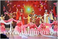 當天活動的最高潮是聞名中外、皇家級的太極門氣功武學藝術化的文化展演,在「世界之愛和平管絃樂團」樂聲中拉開序幕。更有融合心靈與科技、來自未來,如機器戰警般身穿LED燈服裝的青年俠客,以及超越時空,從唐朝貞觀盛世而來的長孫皇后、文成公主,奠基大清帝國三朝盛世的孝莊皇后(大玉兒),以及忠孝兩全的女將穆桂英、花木蘭,和一代巨星麥可・傑克森,紛紛跨越時空來到現場,與一群COSPLAY布袋戲偶的忠義之師,搭配精彩炫目的多媒體背景,讓與會來賓在心靈與視覺的享受中,喚醒人們心中對追求真、善、美的渴望,開啟愛與和平的心境界。第一次參與太極門新春茶敘的台中市議員陳天汶,看到這樣特別的活動後表示,透過中華文化的傳承與延續,喚起大家的良知,維護社會安全,國泰民安。