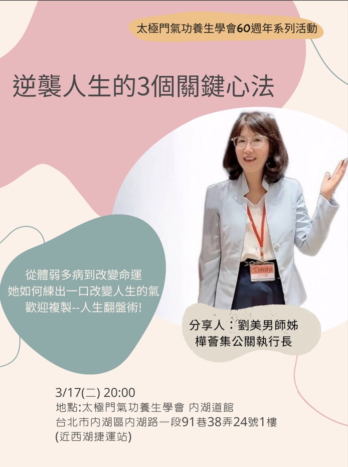 2026-03-17 20:00~21:00 內湖道館 (主講人:劉美男師姊(樺薈集公關執行長))
