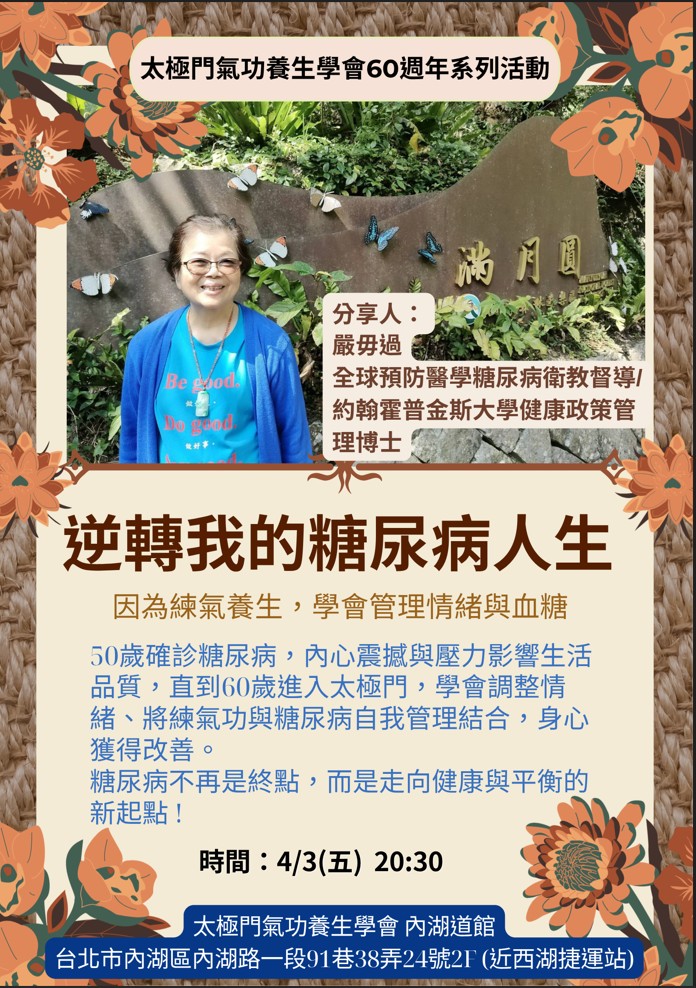 她50歲經診斷罹患糖尿病!內心的震撼與壓力影響了生活品質。直到60歲因為機緣入門練氣養生,身心獲得改變,將練功與糖尿病自我管理結合,讓糖尿病不是終點,而是另一個生活的開始!