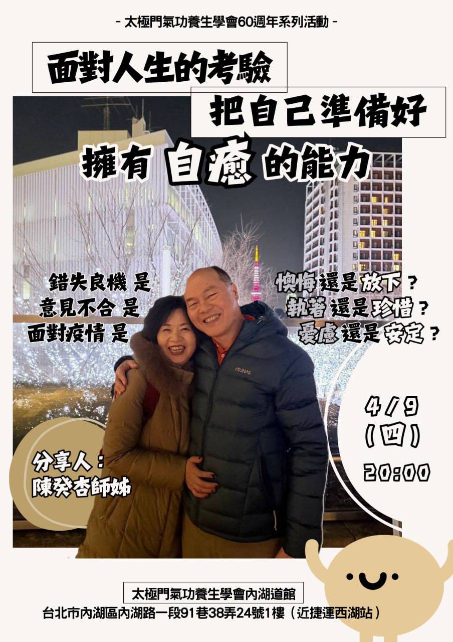 2026-04-09 20:00~21:00 內湖道館 (主講人:陳癸杏)面對人生的考驗,把自己準備好,擁有自癒的能力