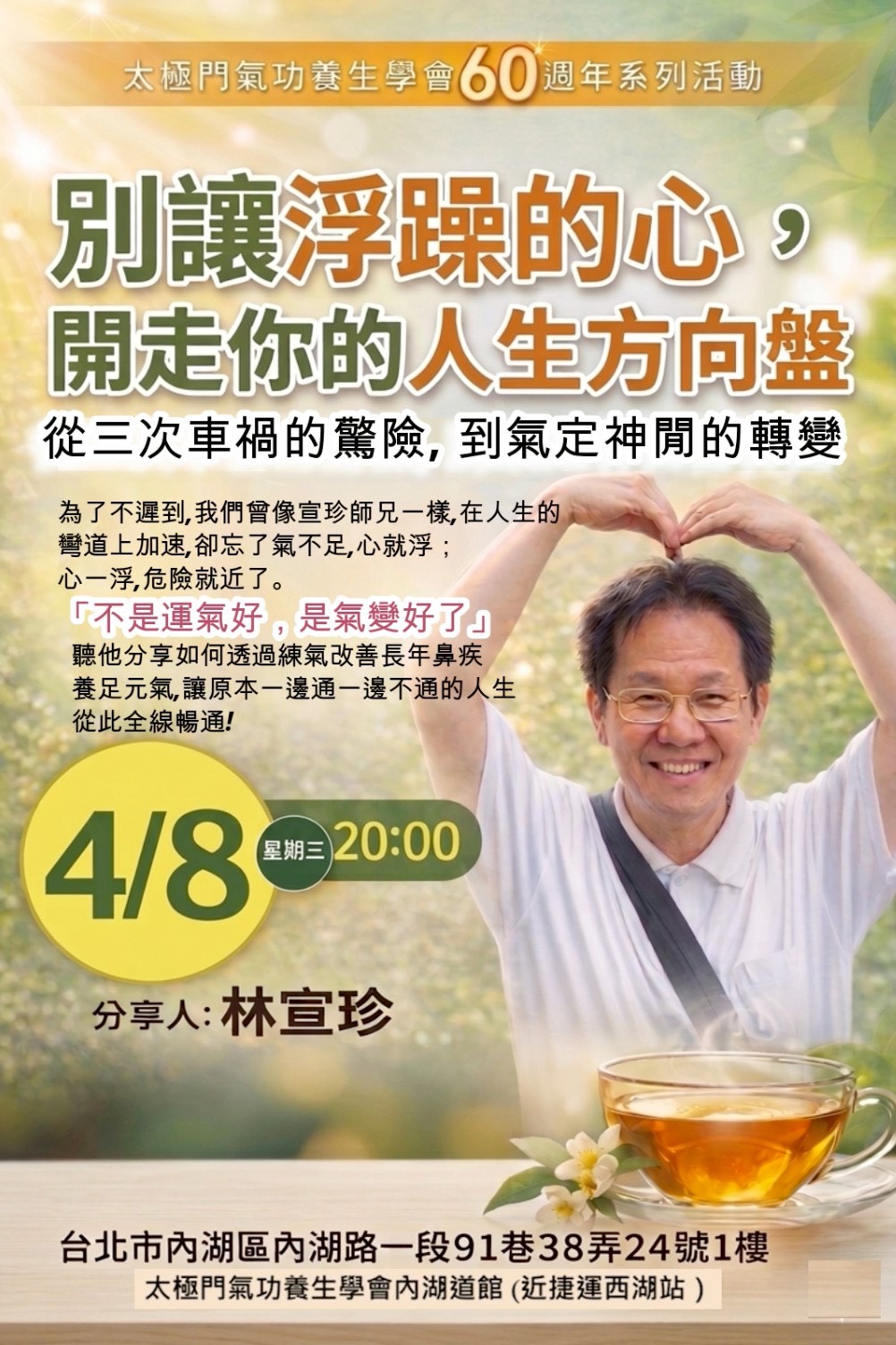 2026-04-08 20:00~21:00 內湖道館 (主講人:林宣珍)別讓浮躁的心,開走你的人生方向盤