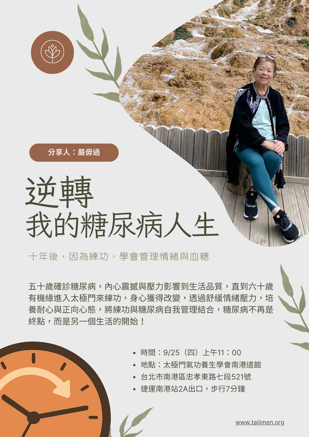 五十歲確診糖尿病,內心震撼與壓力影響到生活品質,直到六十歲有機緣進入太極門來練功,身心獲得改變,透過舒緩情緒壓力,培養耐心與正向心態,將練功與糖尿病自我管理結合,糖尿病不再是終點,而是另一個生活的開始...