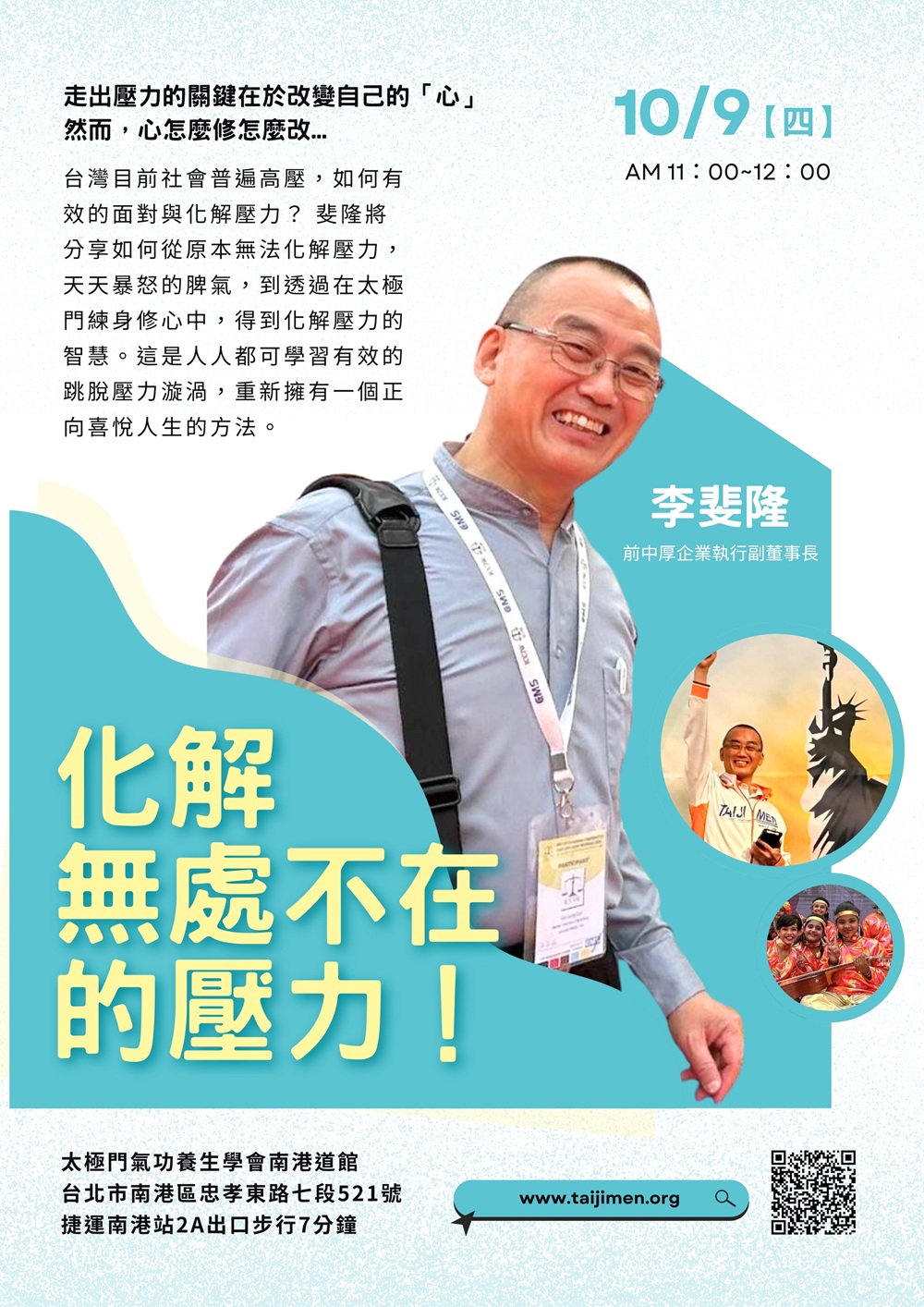 台灣目前社會普遍高壓,如何有效的面對與化解壓力? 分享人將分享如何從原本無法化解壓力,天天暴怒的脾氣,到透過在太極門練身修心中,得到化解壓力的智慧。這是人人都可學習_有效的跳脫壓力漩渦,重新擁有一個正...
