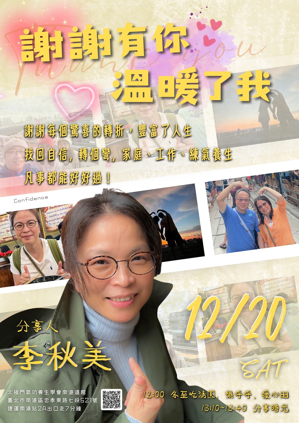 2025-12-20 13:10~13:40 南港道館 (主講人:李秋美)謝謝每個驚喜的轉折,豐富了人生。找回自信,轉個彎,家庭、工作、練氣養生凡事都能好好過!