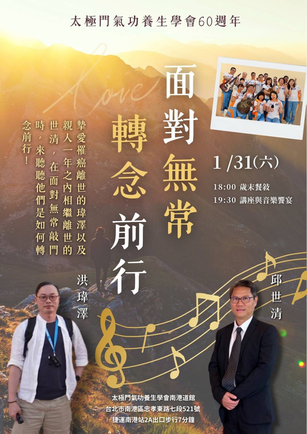 2026-01-31 19:30~20:30 南港道館 (主講人:洪瑋澤、邱世清)摯愛罹癌離世的瑋澤以及親人一年之內相繼離世的世清,在面對無常敲門時,來聽聽他們是如何轉念前行!