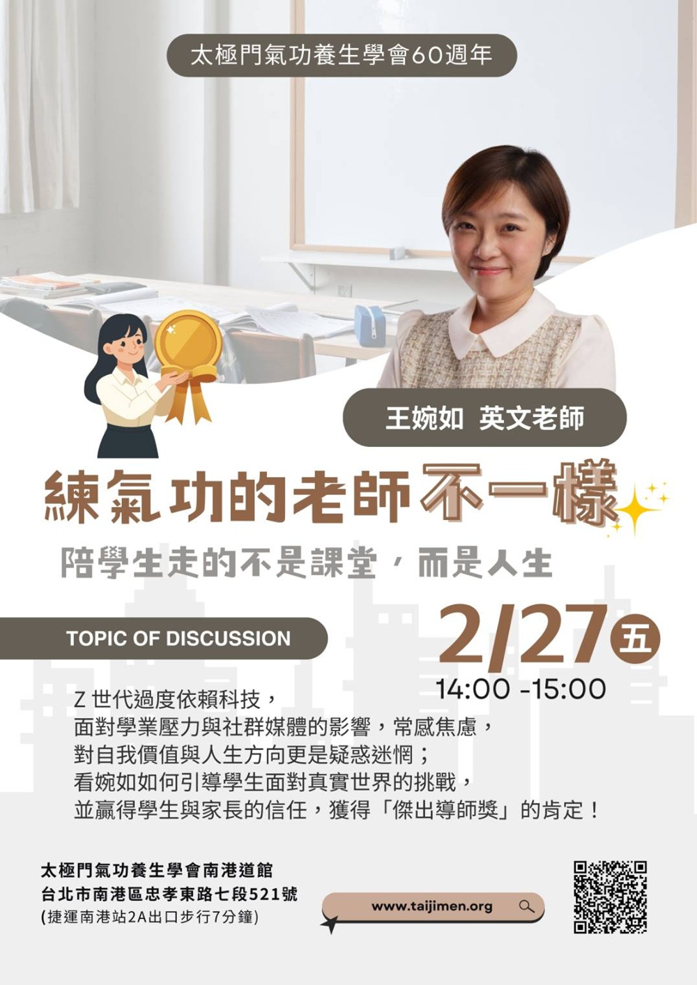 2026-02-27 14:00~15:00 南港道館 (主講人:王婉如)Z 世代過度依賴科技,面對學業壓力與社群媒體的影響,常感焦慮,對自我價值與人生方向更是疑惑迷惘;看婉如如何引導學生面對真實世界的挑戰,並贏得學生與家長的信任,獲得「傑出導師獎」的肯定