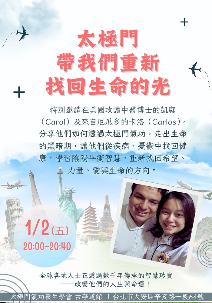 2026-01-02 20:00~20:40 古亭道館 (主講人:美國攻讀中醫博士的凱庭 (Carol)及來自厄瓜多的卡洛(Carlos))