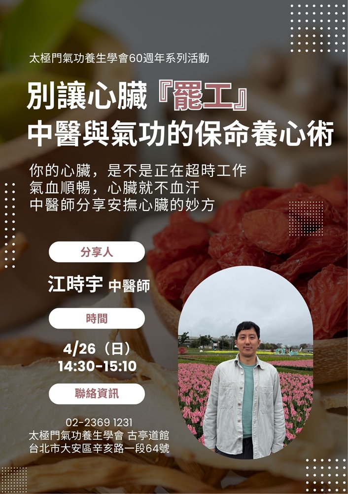 2026-04-26 14:30~15:10 古亭道館 (主講人:江時宇中醫師)