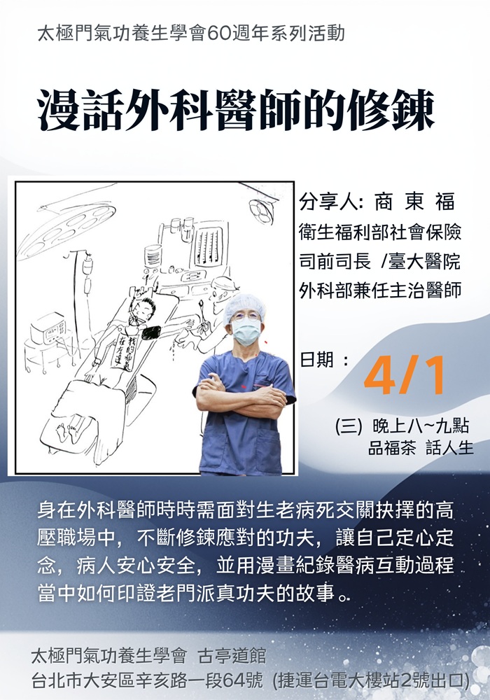 2026-04-01 20:00~21:00 古亭道館 (主講人:商東福 衛生福利部社會保險司前司長/臺大醫院外科部兼任主治醫師)