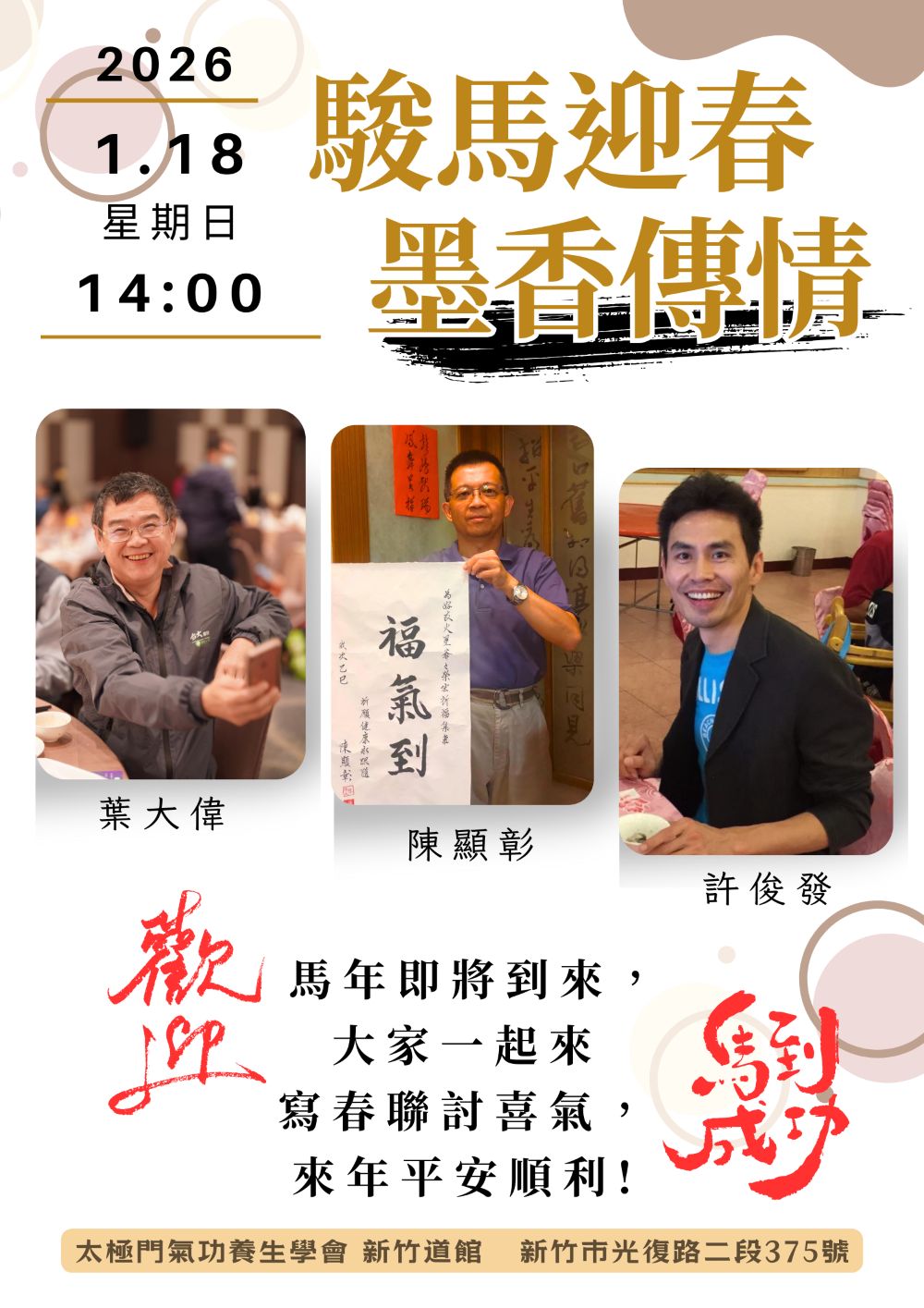 2026-01-18 14:00~ 新竹道館 (主講人:葉大偉、陳顯彰、許俊發)馬年即將到來,歡迎大家一起來寫春聯討喜氣,來年平安順利 事事馬到成功喔!