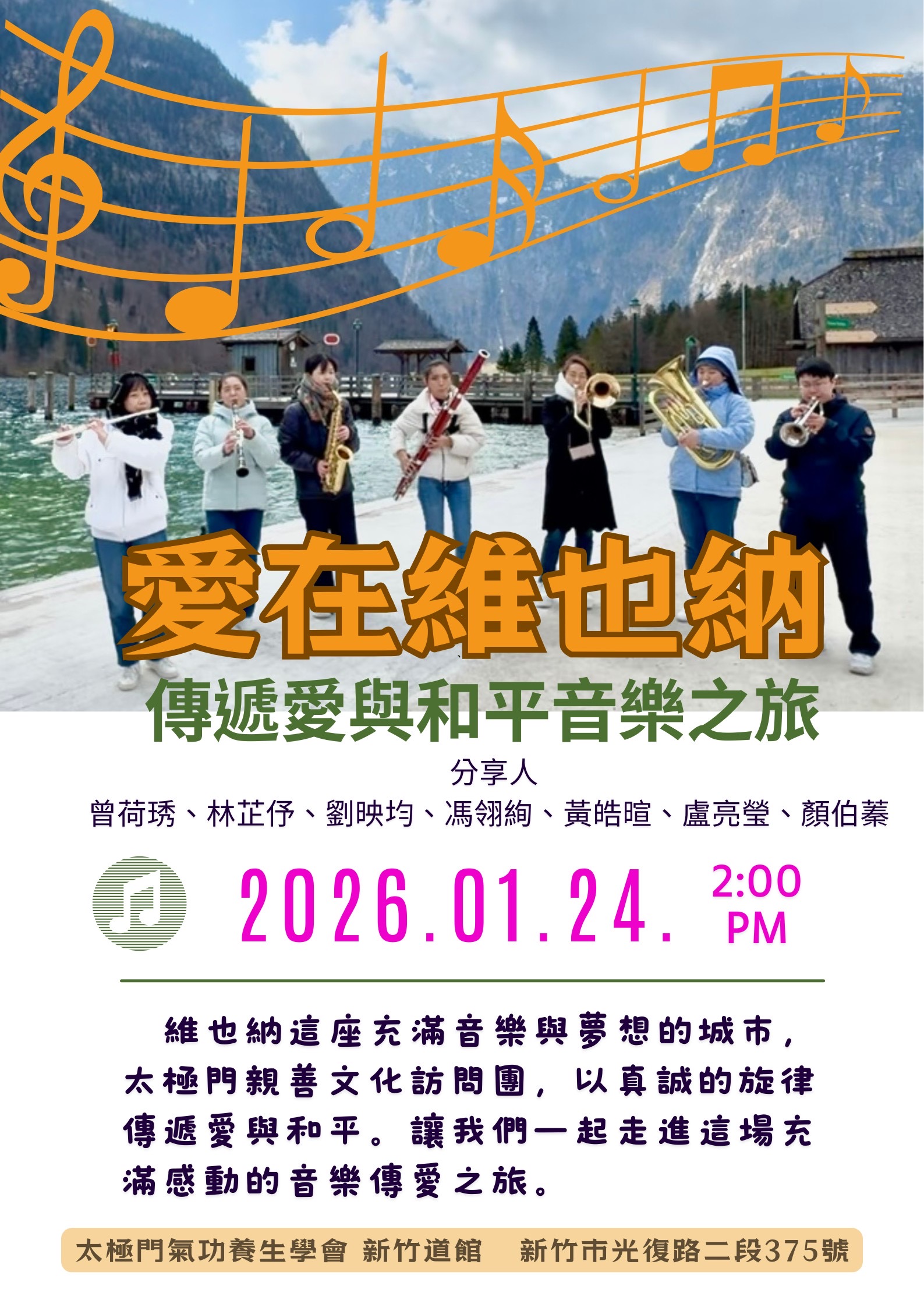 2026-01-24 14:00~ 新竹道館 (主講人:曾荷琇、林芷伃、劉映均、馮翎絢、黃皓暄、盧亮瑩、顏伯蓁)維也納這座充滿音樂與夢想的城市,太極門親善文化訪問團,以真誠的旋律傳遞愛與和平。讓我們一起走進這場充滿感動的音樂傳愛之旅。