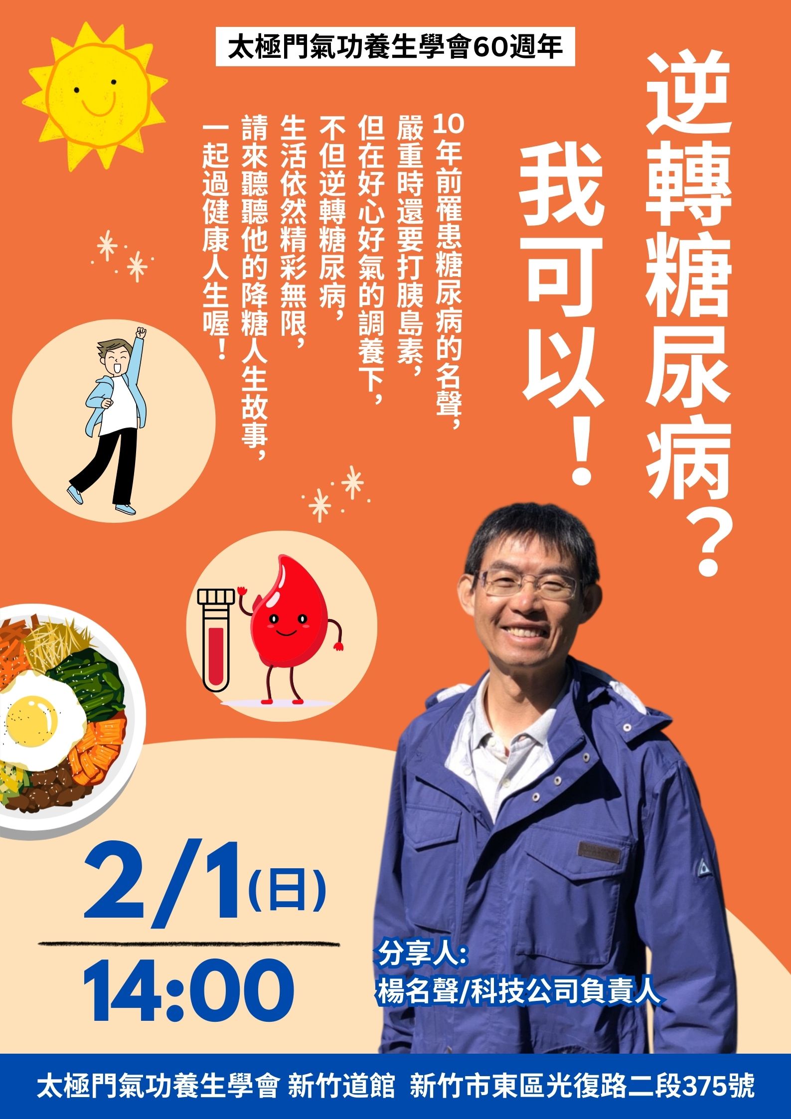 2026-02-01 14:00~ 新竹道館 (主講人:楊名聲)10年前罹患糖尿病的名聲,嚴重時還要打胰島素,但在好心好氣的調養下,不但逆轉糖尿病,生活依然精彩無限。請來聽聽他的降糖人生故事,一起過健康人生喔!