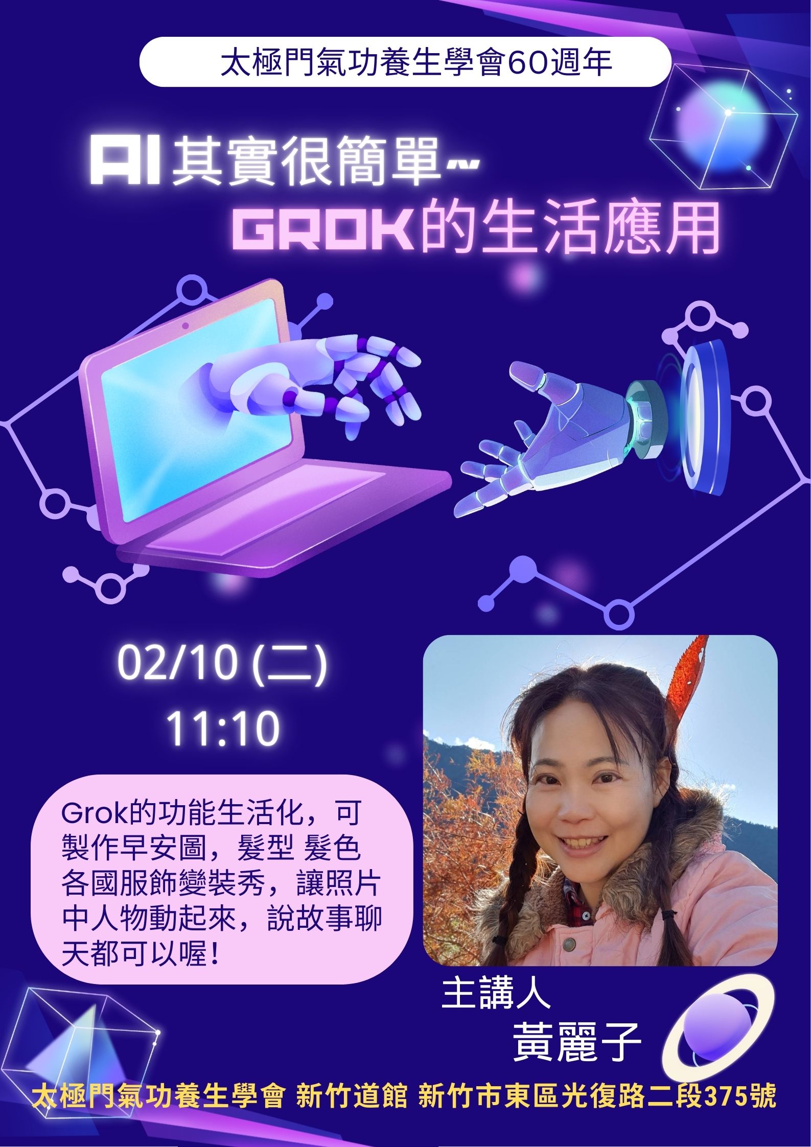 2026-02-10 11:10~ 新竹道館 (主講人:黃麗子)Grok 的功能生活化,可製作早安圖、髮型、髮色、各國服飾變裝秀,讓照片中人物動起來,說故事聊天都可以喔!