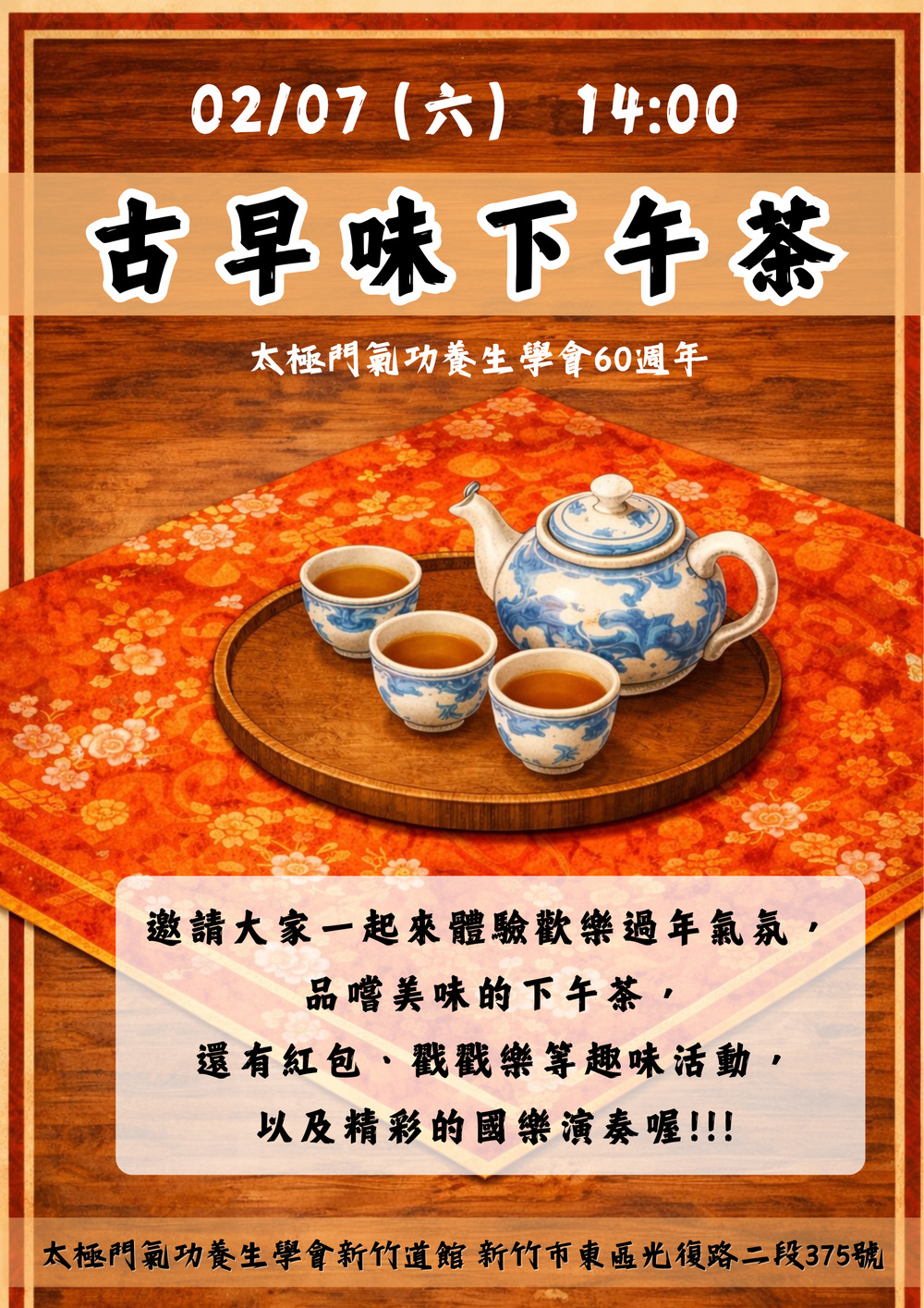 2026-02-07 14:00~ 新竹道館 邀請大家一起來體驗歡樂過年氣氛, 品嚐美味的下午茶,還有紅包、戳戳樂等趣味活動,以及精彩的國樂演奏喔!!!