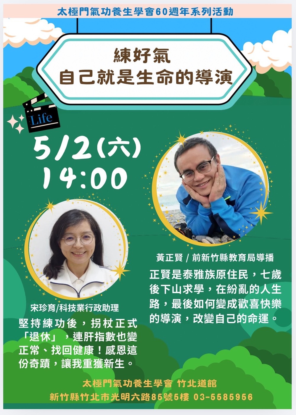 2026-05-02 14:00~ 竹北道館 (主講人:黃正賢/宋珍育)正賢是泰雅族原住民,七歲後下山求學,在紛亂的人生路,最後如何變成歡喜快樂的導演,改變自己的命運。堅持練功後,拐杖正式退休,連肝指數也變正常,找回健康! 感恩這份奇蹟,讓我重獲新生。