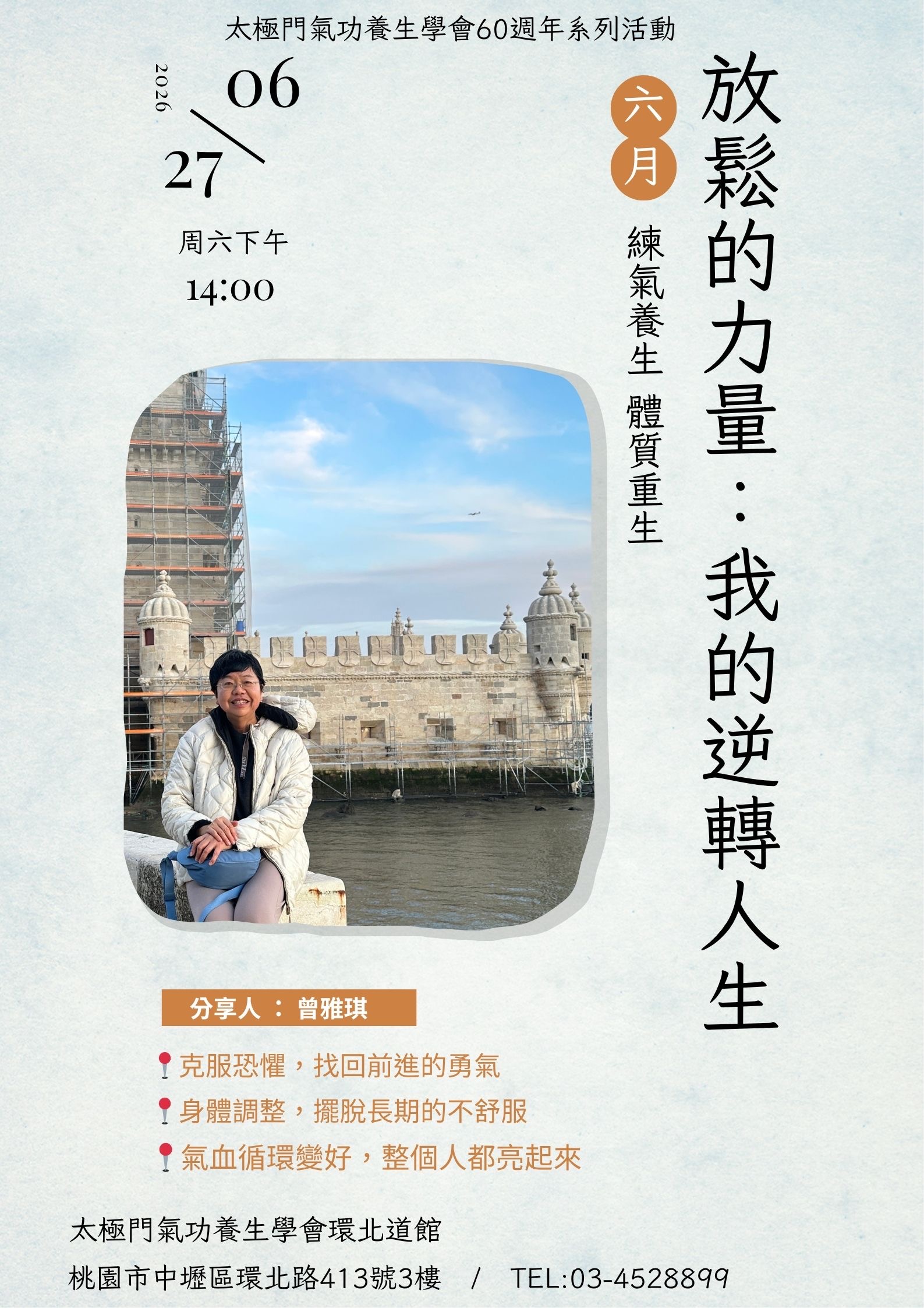 2026-06-27 14:00~ 環北道館 (主講人:曾雅琪)六月練氣養生,體質重生。❤️克服恐懼,找回前進的勇氣❤️身體調整,擺脫長期的不舒服❤️氣血循環變好,整個人都亮起來