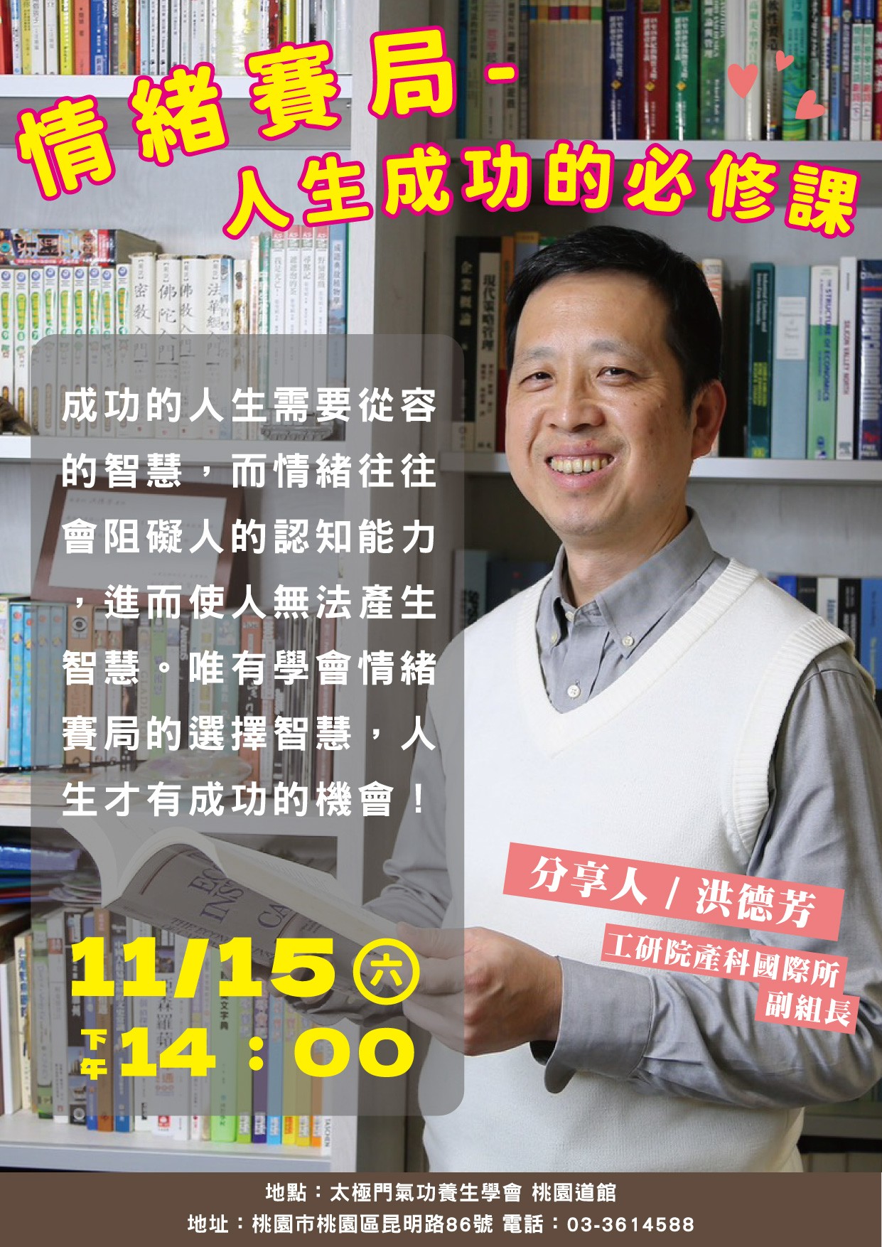 2025-11-15 14:00~ 桃園道館 (主講人:洪德芳)成功的人生需要從容的智慧,而情緒往往會阻礙人的認知能力,進而使人變笨,智慧無法產生。唯有學會情緒賽局的選擇智慧,人生才有成功的機會!