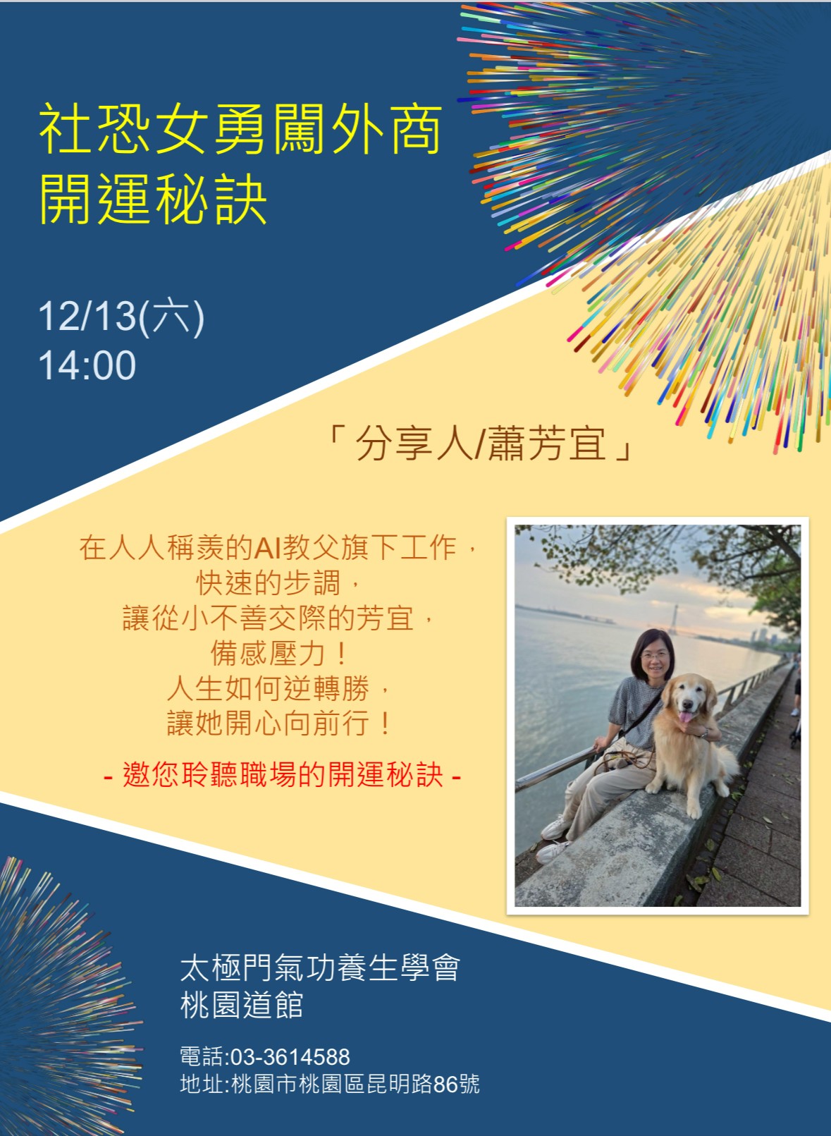 2025-12-13 14:00~ 桃園道館 (主講人:蕭芳宜)在人人稱羨的AI教父旗下工作,快速的步調,讓從小不善交際的芳宜,備感壓力!人生如何逆轉勝,讓她開心向前行!邀您聆聽職場的開運秘訣