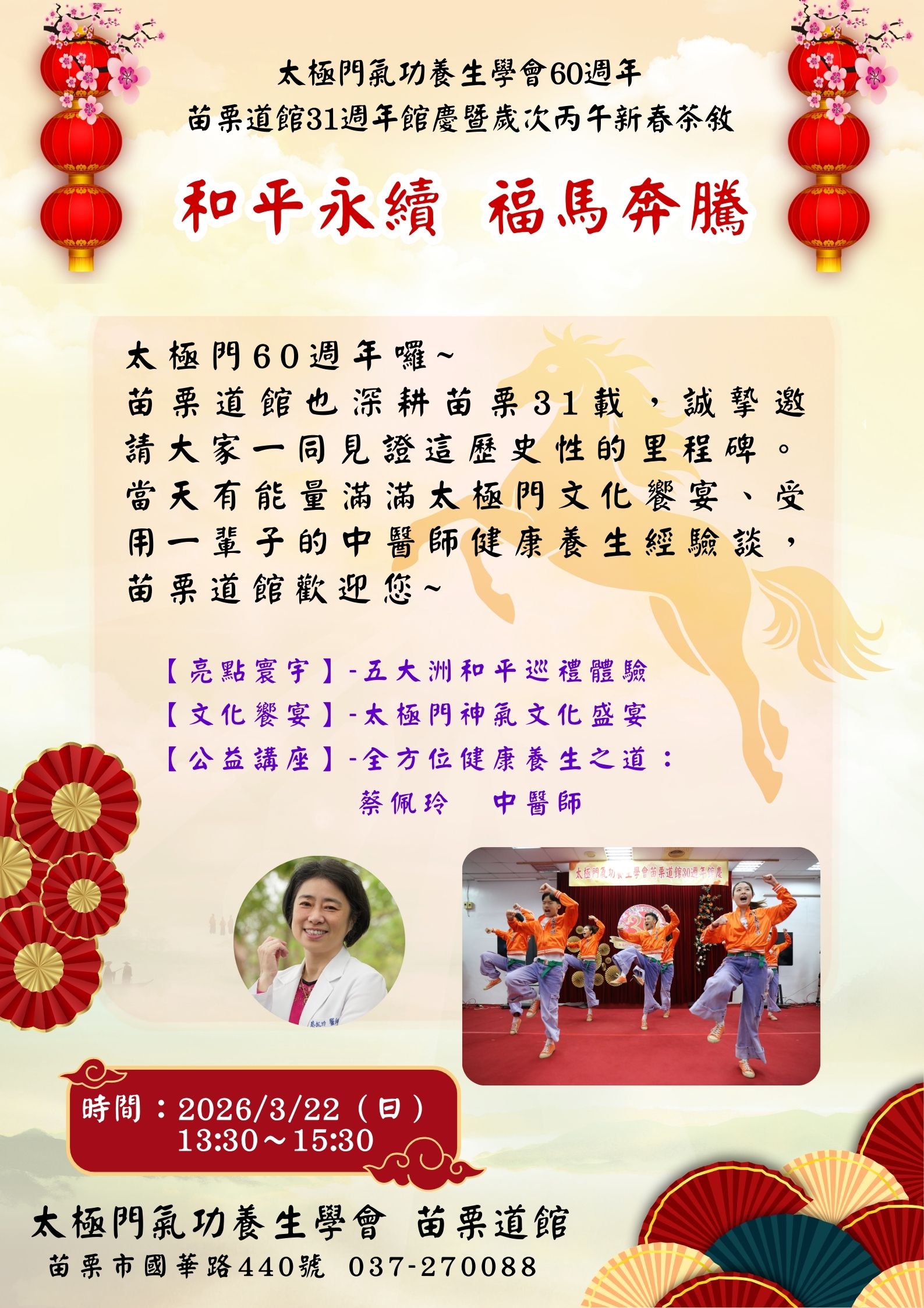 苗栗道館也深耕苗栗31載,誠摯邀請大家一同見證這歷史性的里程碑。當天有能量滿滿太極門文化饗宴、受用一輩子的中醫師健康養生經驗談,苗栗道館歡迎您~
