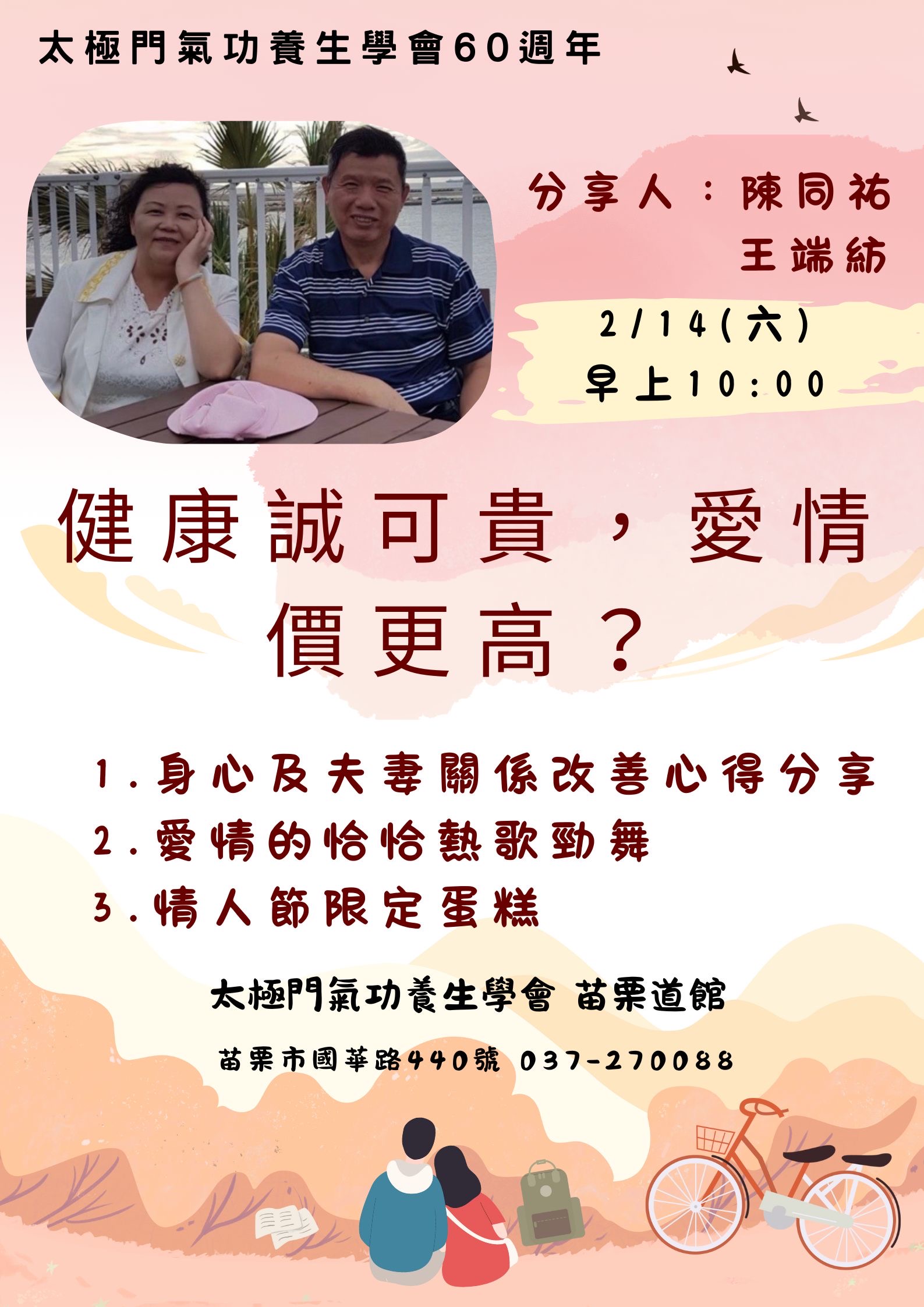 2026-02-14 10:00~ 苗栗道館 (主講人:陳同祐 王端紡)1.身心及夫妻關係改善心得分享2.愛情的恰恰熱歌勁舞3.情人節限定蛋糕
