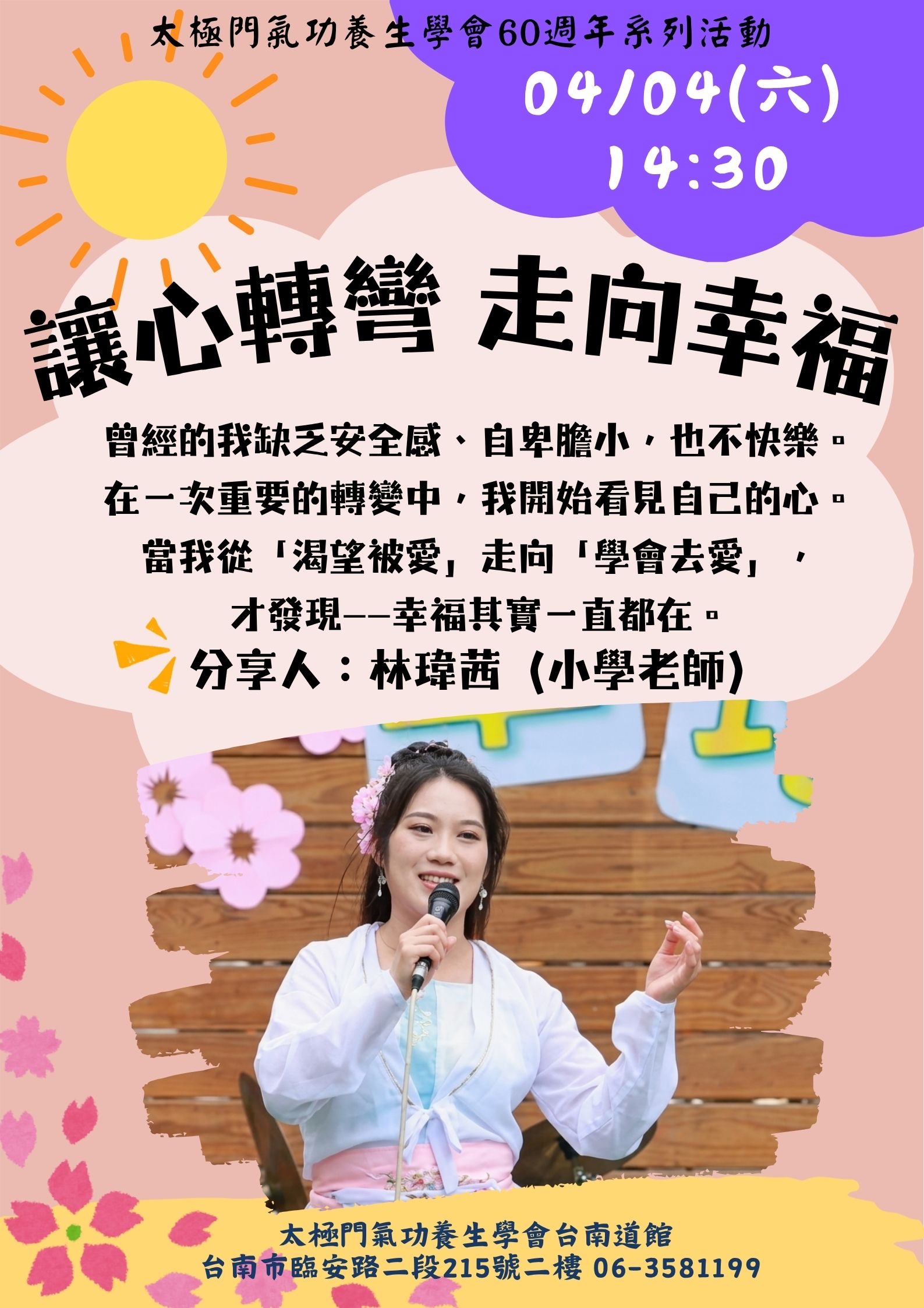 2026-04-04 14:30~16:00 台南道館 (主講人:林瑋茜)曾經的我缺乏安全感•自卑膽小,也不快樂。在一次重要的轉變中,我開始看見自己的心。當我從「渴望被愛,走向「學會去愛」•才發現——幸福其實一直都在。