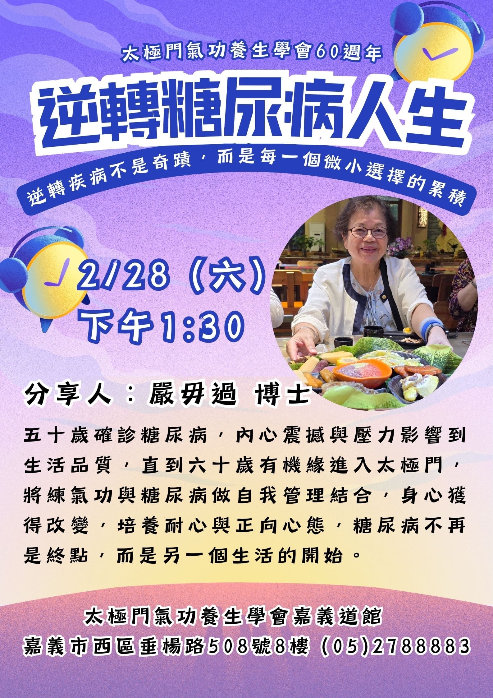 直到六十歲有機緣進入太極門,將練氣功與糖尿病做自我管理結合,身心獲得改變,培養耐心與正向心態,糖尿病不再是終點,而是另一個生活的開始。