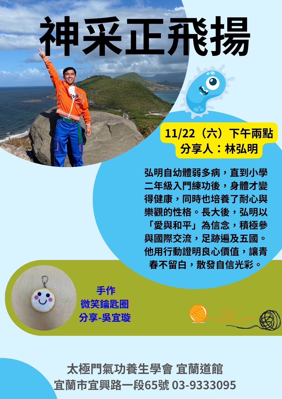 弘明自幼體弱多病,直到小學二年級入門練功後,身體才變得健康,同時也培養了耐心與樂觀的性格。長大後,他更積極地參與國際弘揚行,足跡遍及土耳其、美國與加勒比海的五個國家。在旅程中,他致力於傳遞「愛與和平、...