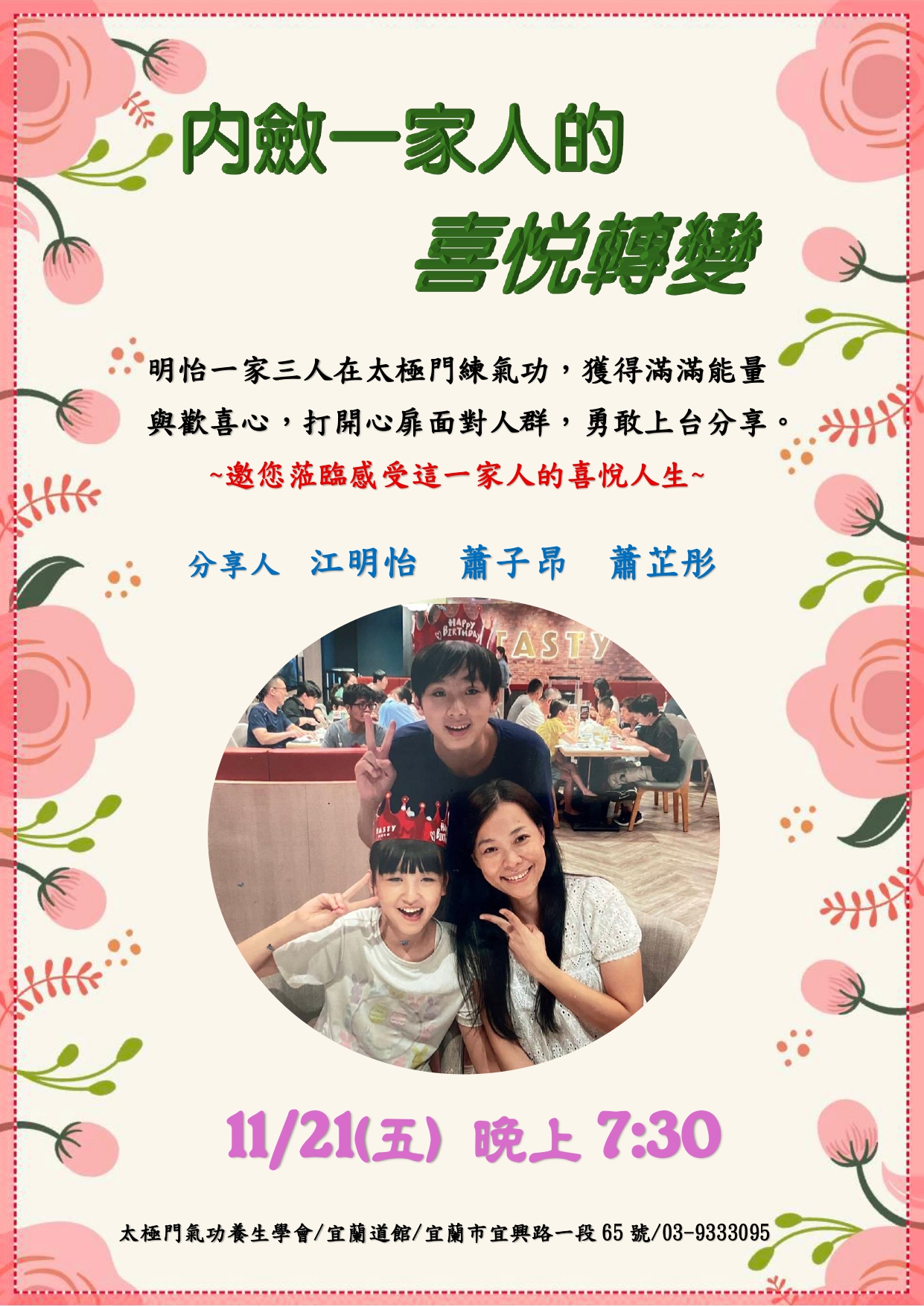 明怡一家三人在太極門練氣功,獲得滿能量與歡喜心,打開心扉面對人群,勇敢上台分享。